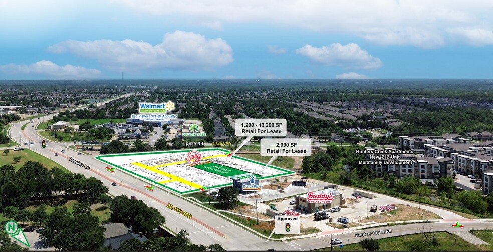 • Site is situated at the NWC of Teasley Lane and Ryan Rd. The siteis only a few blocks away from I-35 and Golden Triangle Mall • 974.5K Estimated Visitors for Walmart Neighborhood Market Annually* (Source: Placer.ai) • Cross Access with Dutch Bro’s and Freddy’s • Site located directly in front of Hunters Creek Apartments a new 212-unit multifamily development. • Multiple national QSR users committed to the project.