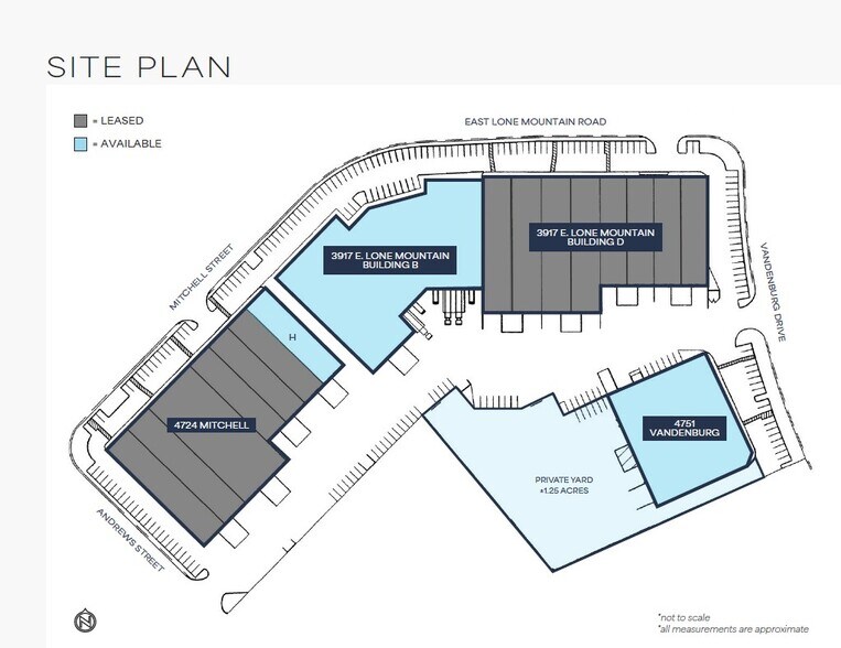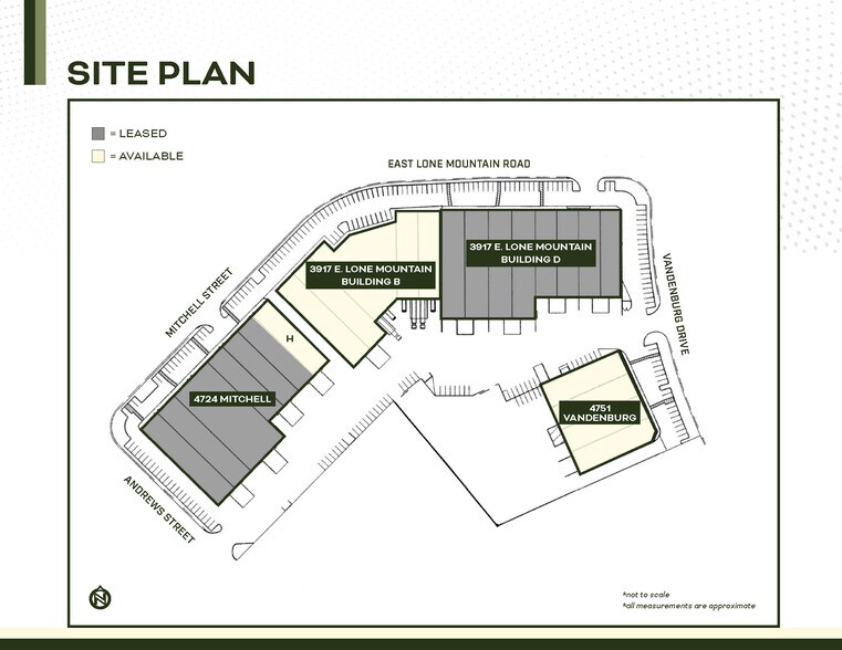 NOW AVAILABLE - 4751 Vandenburg is a ±54,880 SF Industrial unit featuring HVAC office, Evap-cooled warehouse, Three (3) 10’ x 12’ Grade-level doors, Three (3) Dock-high doors, ±24’ Clear Height, multiple skylights in warehouse, and 120/208v, 3-phase power. LEASE RATE : NEGOTIABLE (NNN); CAMs : $0.21/SF. For more information or to schedule a tour please contact Alex Stanisic at 702-369-4874 or Kyle Kirchmeier at 702-369-4862.