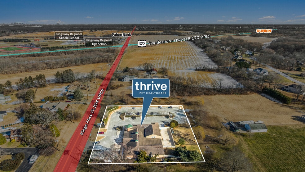 Sands Investment Group is pleased to exclusively offer for sale this 11,665 SF single-tenant Thrive Pet Healthcare Double Net (NN) asset located at 392 Kings Highway in Swedesboro, NJ. Thrive Pet Healthcare is a leading national veterinary services platform, operating more than 400 clinics across 37 states. This offering features a highly passive, landlord-friendly lease structure, with responsibilities limited to the roof and structural components, providing investors with minimal management obligations and durable, predictable cash flow. Strategically located in the Philadelphia MSA (the 7th largest in the United States), the hospital has provided primary care, urgent care, and dentistry to dogs and cats in the region since 1986. Together, these attributes create a unique and compelling investment opportunity.