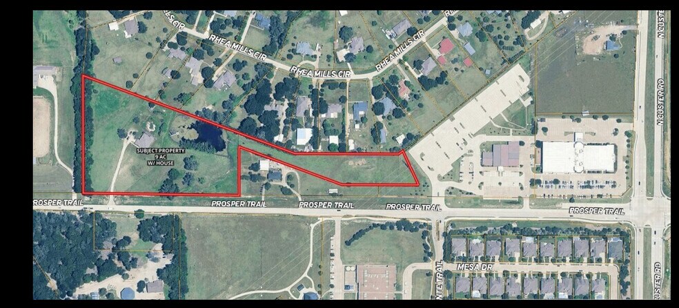 9 Ac land size with 2,500 SF house + swimming pool & pond. Almost 750' of road frontage along Prosper Trail