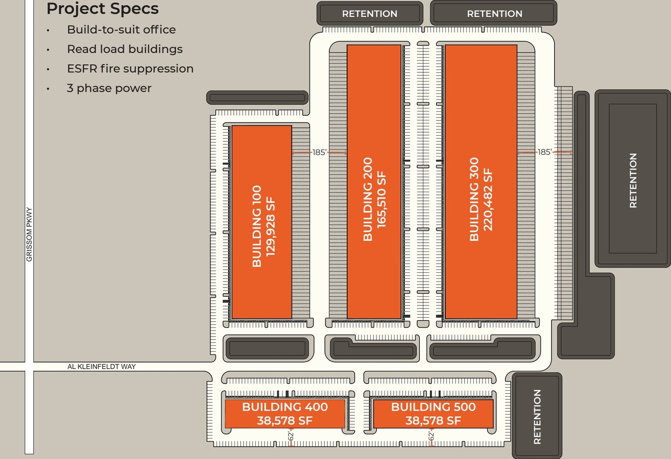 - Five rear-load industrial buildings totaling 593,076 SF, delivering Q1 2027.