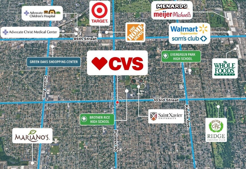 The 15,414-square-foot building is strategically positioned along West 103rd Street (23,000 VPD) and Pulaski Road (29,300 VPD), a major thoroughfare. The property sits within a dense retail corridor anchored by national brands such as Target, Home Depot, Walmart, Sam’s Club, CVS, Jewel-Osco, Aldi, and Staples. Chicago is the third largest metropolitan area in the United States with over 9 million people, and is an international hub for ?nance, commerce, industry, technology, telecommunications, and transportation, with O’Hare International Airport being one of the busiest in the world. The site is also adjacent to Saint Xavier University, which has a student population of approximately 3,300. The surrounding area is well-populated with nearly 490,000 residents within ?ve miles. Those of which earn an average household income exceeding $70,000.