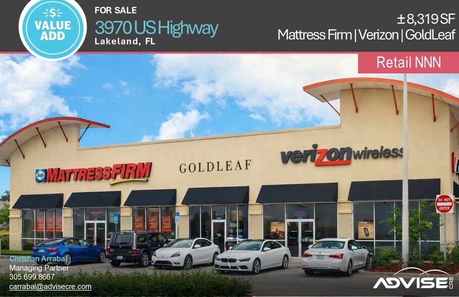 AdviseCRE is pleased to present a compelling value-add opportunity to acquire the 100% fee simple interest in 3970 US Highway 98 N in Lakeland, Florida—a ±8,319 SF, 100% leased multi-tenant NNN retail outparcel positioned along one of Central Florida’s most dominant retail corridors. The Property is leased to a strong mix of nationally recognized tenants, including Mattress Firm, Verizon Wireless, and Gold Leaf, providing stable, diversified in-place cash flow backed by corporate credit tenancy. Anchored by long-tenured operators with 20+ years of occupancy, the asset offers durable income with a weighted average lease term of approximately 4.0 years and minimal landlord responsibility under a true triple-net structure.