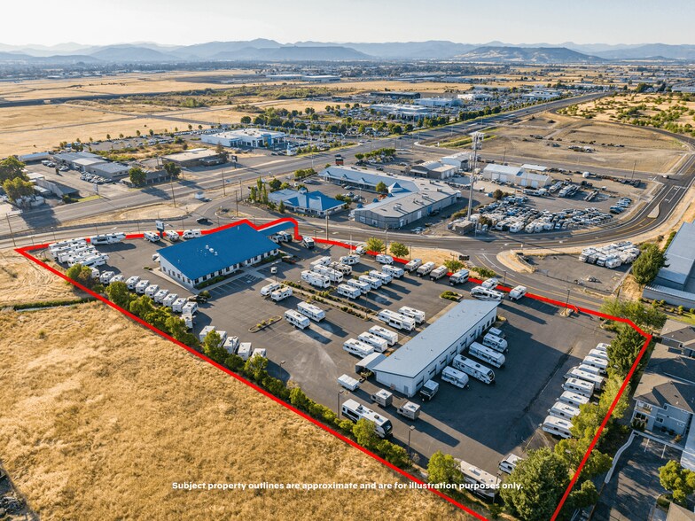Merit Commercial Real Estate is pleased to exclusively present for lease 1600 Coker Butte Road, a highly-visible flex industrial asset located in beautiful Medford, Oregon (the "Subject Property"). A trophy automotive-focused property, the Subject Property is a highly flexible corner site and has served well for a variety of users, including car rentals, car sales and service, and RV sales and service. The front showroom and office building is an expansive clear-span steel-frame building originally built in 2001. The shed roof allows for abundant natural light into the clear-span showroom floor, while the high-quality finishes and stucco exterior create a modern and retail-focused aesthetic. Inside, the open-concept central core leads to several private offices, kitchens, breakroom, storage, and more. The interior layout is well-designed and flexible for nearly any user. Outside, the Subject's 3.66 acres lot is 100% fully paved and lighted, an extremely rare characteristic in Southern Oregon and the perfect inventory display space. The expansive paved yard appears to be well-maintained, with recent striping and pleasant landscaping. While not currently fully fenced, vehicle access is controlled via only two dedicated driveways which could be gated. The rear shop building is a similar clear-span steel-frame building with matching exterior styling. Enjoying a dedicated public entrance with a service counter, private offices, kitchen and restroom, the shop includes (6) 10'x10' overhead doors, 4 hydraulic lifts, multiple gas heaters, in-slab drains, and 16' max clear height. While originally designed to best fit an automotive sales/service user, the Subject Property is a strong fit for a wide variety of users seeking the winning combination of strong visibility, great retail space, best-in-class paved and lighted yard, and an on-site service shop, all within the growing north Medford neighborhood. Prospective users are encouraged to submit all proposals; all parties are to note that Landlord reserves the right to approve prospective tenant's use of the spaces. Contact brokers to arrange a tour and get more information.