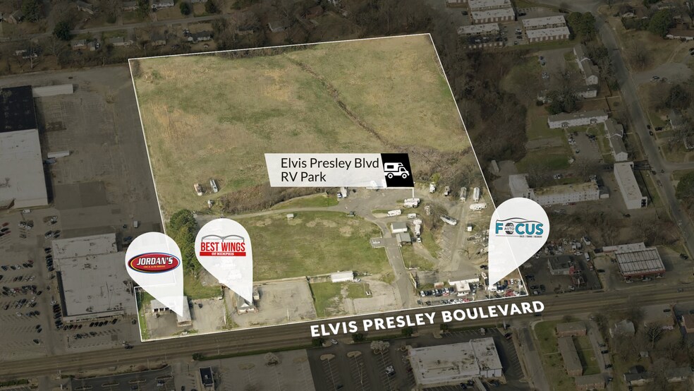 Rare réaménagement générant un revenu dans le quartier de Whitehaven. 21.62 AC doit être vendu ensemble. À l'heure actuelle, il y a cinq occupants générateurs de revenus : le parc de VR Elvis Presley, le concessionnaire automobile, le magasin de pneus, le panneau d'affichage et le Best Wings of Memphis.