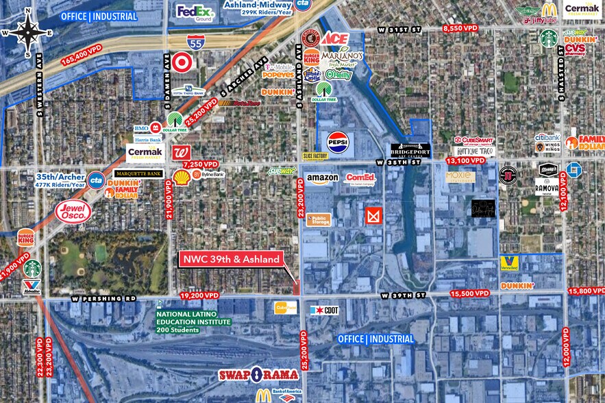 39th & Ashland se trouve à l’intersection de trois quartiers de Chicago (McKinley Park, Bridgeport et Back of the Yards) et de deux corridors très fréquentés. Avec une excellente visibilité, une intersection avec feux de signalisation et une proximité immédiate à l’I-55 ainsi qu’à la ligne Orange de la CTA, le site offre un accès fluide au trafic local et à la connectivité régionale. Cela en fait un emplacement idéal pour les opérateurs de restauration rapide (QSR), médical, commodité, carburant ou services financiers cherchant à s’implanter dans une zone à fort trafic avec une densité élevée de population résidentielle et active en journée.