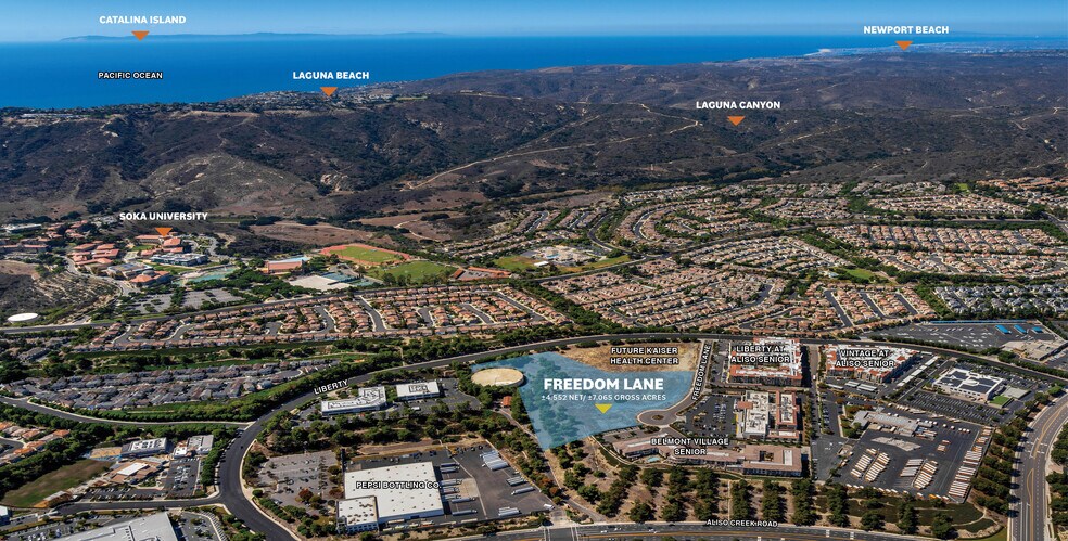 Le site Freedom Lane est situé près de la promenade Aliso Viejo et de Liberty sur Freedom Lane, directement à côté de trois immeubles de logements pour personnes âgées de classe A et d'un futur complexe de soins de santé Kaiser.