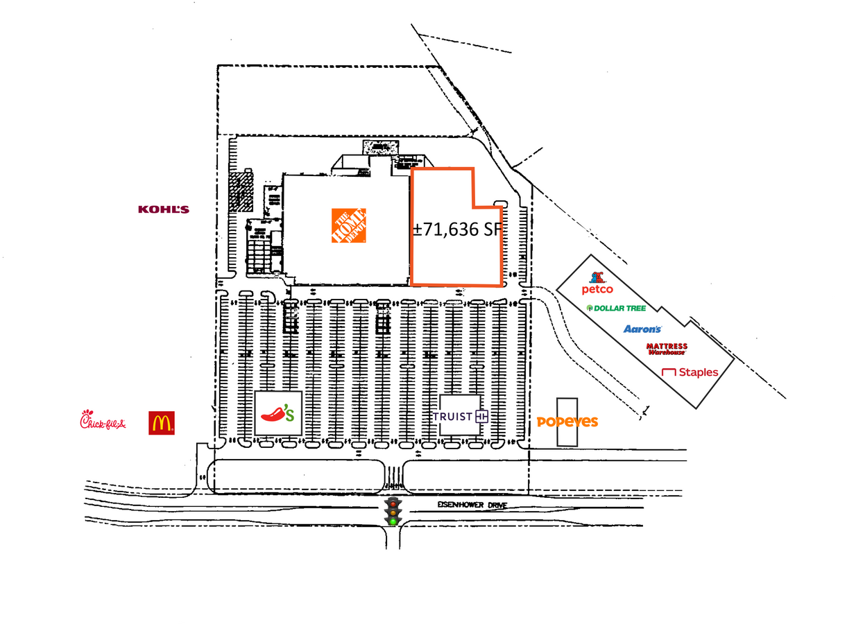 71 462 SF Disponible à Hanover, PA Site situé à une intersection signalée sur la promenade Eisenhower en direction du centre Les détaillants de la région comprennent The Home Depot, Kohl's, Petco, PetSmart, Walmart, Sam's Club, Giant Foods, ALDI, TJ Maxx, Ross Dress for Less, Mattress Warehouse, Target, Aaron's, Staples, Hobby Lobby, Big Lots, Rite Aid, CVS Pharmacy et plus encore