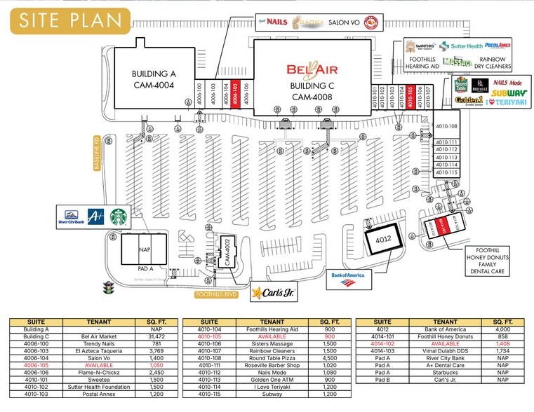 - Les coTenants comprennent Bel-Air, Starbucks, Subway, Bank of America, Round Table, Carl's Jr, Golden 1