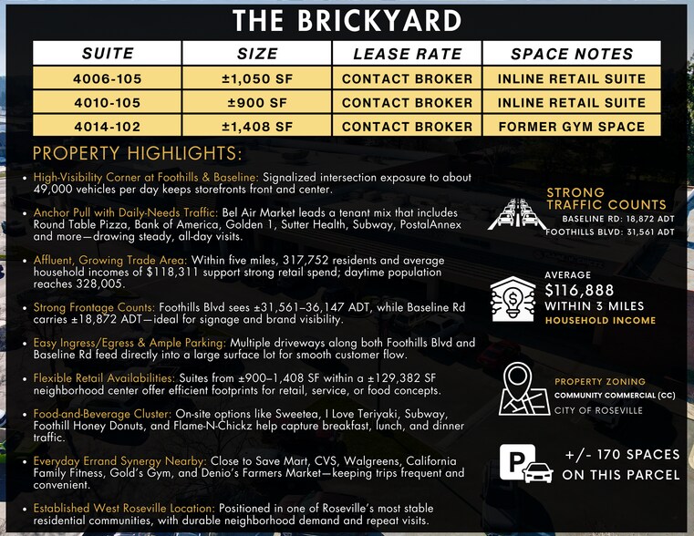 The Brickyard 4008 Foothills Blvd 900–34 826 pi² d'espace disponible • Commerce de détail • Roseville, CA 95747