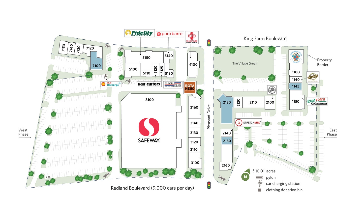 King Farm Village Center est situé dans la communauté planifiée par un maître connue sous le nom de King Farm Village, qui est située dans la banlieue prospère de Rockville, au MD. La propriété est ancrée par l'épicerie Safeway et est située dans un sous-marché densément peuplé.