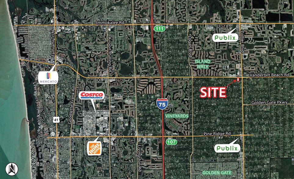 Terrains rarement disponibles à la vente dans une zone à forte demande Emplacement exceptionnel à Naples, Floride Situé à l'intersection du chemin Vanderbilt Beach et du boulevard Collier Plus de 200 pieds de façade le long de la route Vanderbilt Beach avec une visibilité de plus de 40 000 véhicules par jour Revenu moyen des ménages de plus de 125 000$ à moins de 1 mille du site
