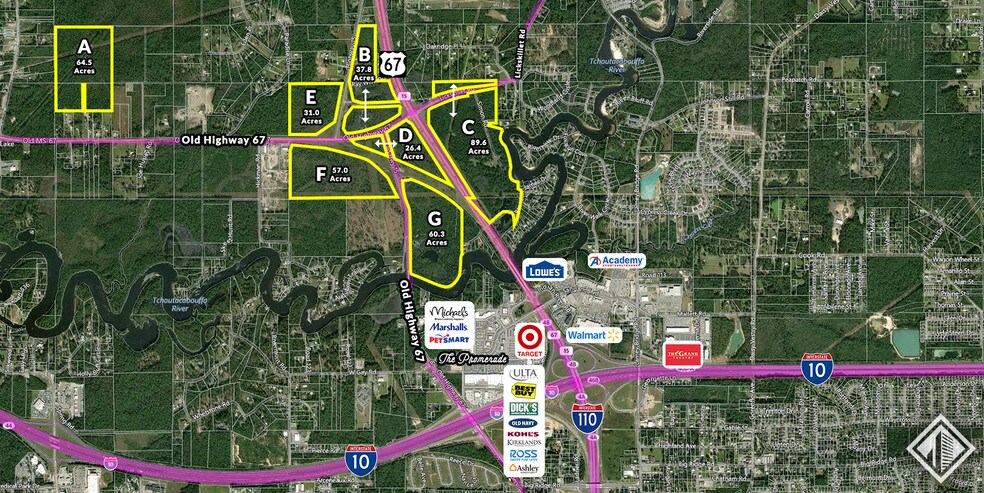 Southeast Commercial est heureux d'offrir à vendre 366 acres à environ 1 mille au nord de l'intersection I-10 et I-110, la majorité de la propriété étant située à l'intersection de la route 67 (I-110 Nord change à la route 67) et du chemin Lickskillet. Cette propriété se trouve à seulement ½ mile de The Promenade qui abrite les seuls produits de sport Target, Kohl's, Bed Bath & Beyond, Kirkland's, Dick's Sporting Goods. Un rayon de 1,5 mille de la propriété offre plus de 1,5 mm pieds carrés de détaillants et de restaurants nationaux, régionaux et locaux.