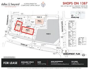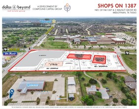 Building description : Property Highlights – Shops on 1387 Signalized Hard corner at FM-1387 & Walnut Grove with 24,000+ VPD and excellent visibility/access Adjacent to grocery-anchored retail (Tom Thumb) and McDonald’s, driving strong daily traffic Right across from Midlothian Heritage High School (±1,800) and Walnut Grove Middle School (800+) students) Surrounded by rapid residential growth, supporting strong daytime and evening demand Building highlights Building B – Retail / Restaurant • ±14,800 SF total retail building , Divisible suites from 1,200 – 3,500 SF • Designed for restaurant, fast casual, and service-oriented retail , • Ideal for Coffee, Casual dining, Dessert, and boutique retail concepts • Strong visibility along FM-1387 with high traffic counts • Benefits from direct cross-traffic from adjacent national retailers • High school proximity drives consistent daytime and after-school traffic • Built for repeat-visit, daily-needs retail users Building C – Medical / Professional • ±11,200 SF professional / med-tail building , Divisible suites from 1,200 – 3,500 SF • Designed for medical, dental, and general professional users , Ideal for urgent care, dental, med spa, fitness, and office users • Positioned to serve dense surrounding residential communities • Stable, insurance-backed tenant profile with repeat patient visits • Complements retail traffic while maintaining quieter professional environment • Strong long-term demand driven by population growth and family demographics