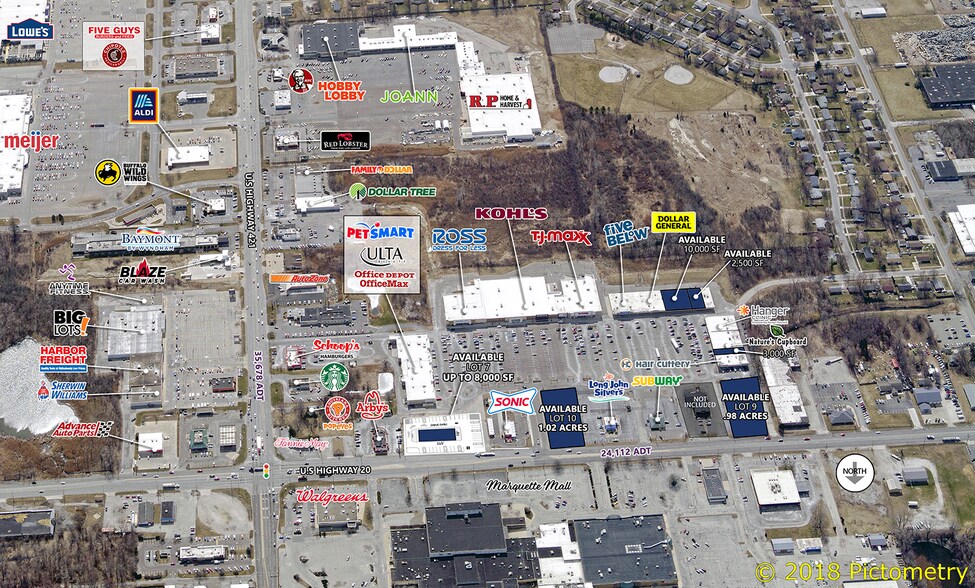 - Intersection signalée en face du centre commercial Marquette sur la route 421 des États-Unis et la route 20 des États-Unis