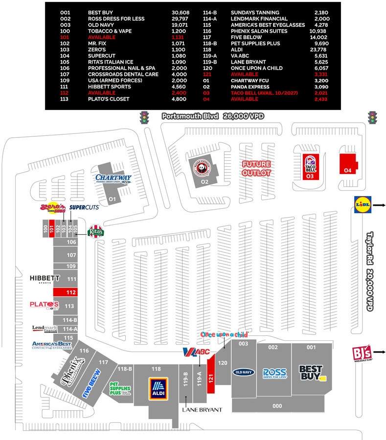 The center serves the Western Branch and Northern Suffolk trade areas and benefits from strong traffic, excellent visibility, and a lineup of national anchors that drive consistent customer visits.