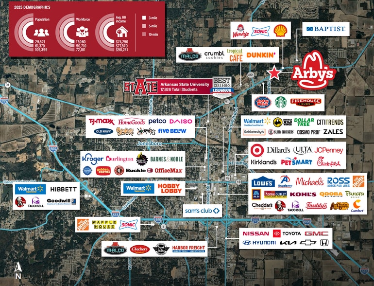 The freestanding drive-thru prototype aligns with Arby’s high-throughput operating model, capturing commuter demand and supporting strong unit-level performance. The surrounding trade area includes national retailers such as Walmart, Lowe’s, Sam’s Club, Hobby Lobby, T.J. Maxx, Petco, ALDI, Firehouse Subs, Dunkin’, Tropical Smoothie Café, and multiple automotive and service operators, reinforcing the corridor’s role as Jonesboro’s dominant retail destination.
