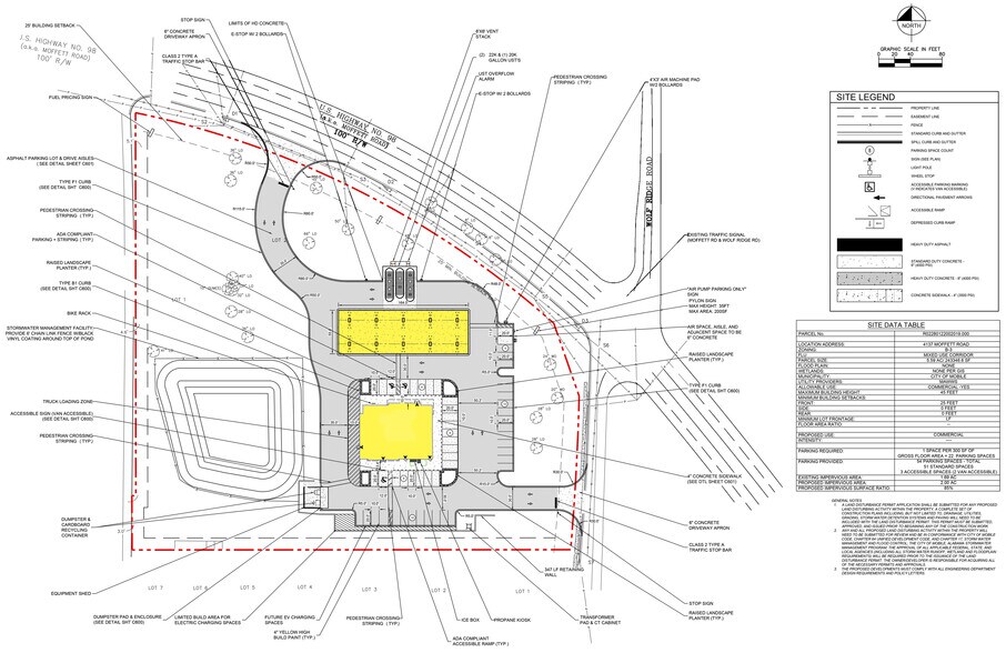 Ideally located site available for potential redevelopment opportunity, or to purchase and lease out to create an income-producing investment property. Approximately 5.5 AC at the signalized intersection of Moffett Road (US Highway 98) and Wolf Ridge Road. Nearly ±600’ of frontage on a portion of Moffett Road that sees traffic counts of 40,428 AADT as of 2024, per ALDOT. Situated just over 1 mi west of Interstate 65 with average annual daily traffic counts of 101,694 as of 2024. Property is currently zoned B3 - Community Business, allowing for a range of potential uses.