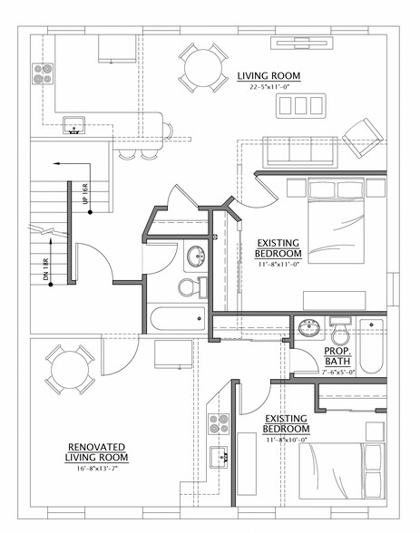 - Open floor plan with brick walls
