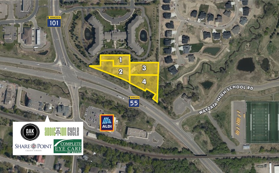 • L'accès se fera par la route d'accès du côté nord de la propriété par l'autoroute 101 • Façade sur l'autoroute 55 et la route 101 • Emplacement idéal pour les logements pour personnes âgées, appartements au prix du marché, logement coopératif • Zoné pour résidentiel - Multifamilial (R4) • Guidé pour High Desnity Residential (HDR) • Wayzata ISD #284