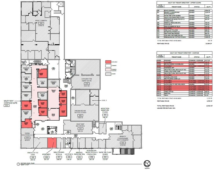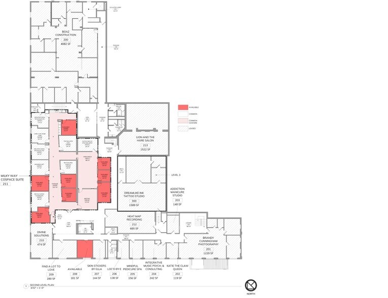 CoSpace features 16 well-lit office suites, ample common areas, a conference room, a private kitchen, and shared office administration facilities. The space is designed to foster collaboration with soft seating in bright, natural light-filled areas, complemented by secure parking, access control, and an on-site gym. Modern cabinetry, skylights, large office doors, expansive windows, exposed rafters, and custom artwork by Taylor Smith enhance this modern workspace. The Milky Way Co Work Space Amenities include: New Buildout, High Speed WiFi, Collaboration Area, Food Service, Coffee, Printer Services, Conference Room, Access Control, and Natural Light.