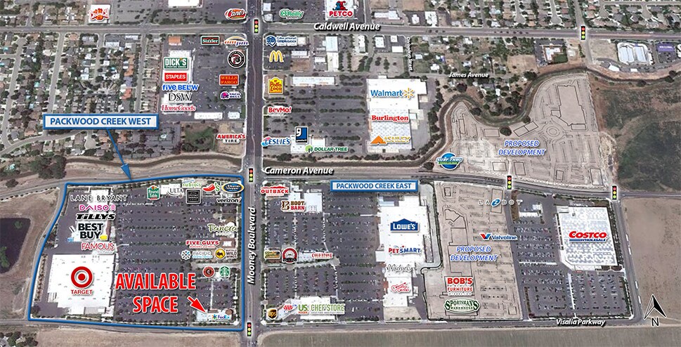 Packwood Creek Shopping Center is a regional power center development located at the southernmost part of Mooney Boulevard (Hwy 63). As the largest city between Fresno and Bakersfield, the City of Visalia serves as a regional trading center for an estimated 468,507 people living within the Tulare, Kings, southern Fresno and northern Kern Counties. Visalia’s current population is roughly 147,000. Consistent with growth trends else where in the Central Valley, the city of Visalia has attracted significant residential growth during the past decade as residents of the Bay Area and Southern California look to take advantage of the low cost of living, attractive housing market and diverse employment base.