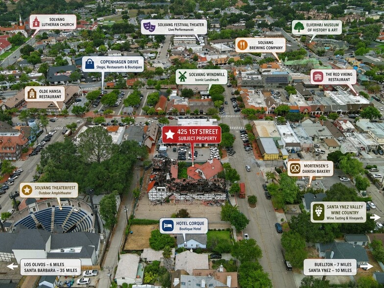 425 1st Street presents a rare ±21,344 SF VMU (Village Mixed Use) development opportunity located in the heart of Solvang’s premier tourism corridor, just one block from Copenhagen Drive. Formerly the Water Wheel property and scheduled for demolition, the site offers a true clean-slate for a variety of uses including boutique hotel, mixed-use, residential, or senior housing. Positioned within the highly desirable Santa Ynez Valley, the property benefits from strong year-round tourism, walkability to restaurants, tasting rooms, and retail, and a notable lack of new boutique hospitality supply. VMU zoning provides flexibility for multiple development strategies, with potential to enhance density through California State Density Bonus Law (buyer to verify).