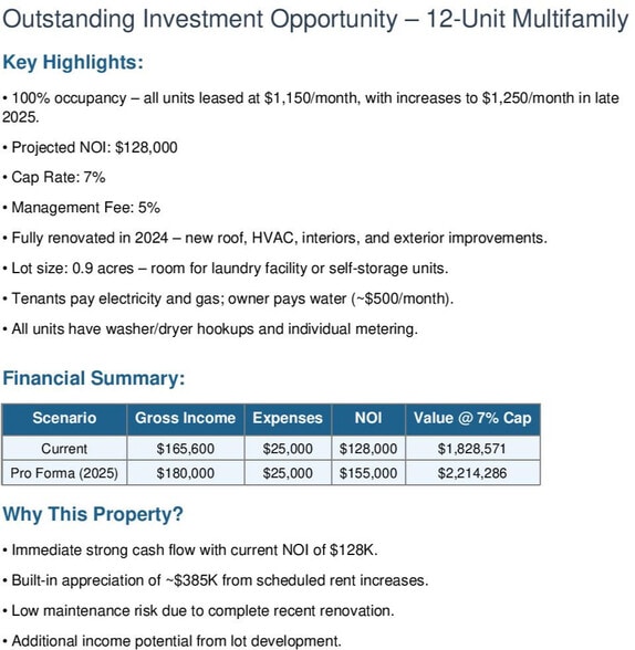 Possibilité d'investissement ! Les 12 logements sont occupés à 100 % - actuellement loués entre 1 000$ et 1 100$, mais pourraient être augmentés à 1 250$. Toutes les unités sont de 2 BR, 1 BA. Nouveau toit et égout. Les taxes sont de 5 000$ à 6 000$. Il y a de l'espace pour construire des unités de libre-entreposage ou une buanderie. Frais de gestion 5 %, taux de plafonnement de 7 %