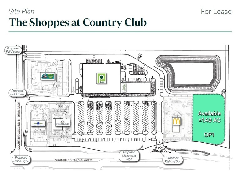 Outparcel Lease Opportunity – Dundee Road Corridor Outparcel 1 (±1.49 acres) is available for lease within a newly developed Publix-anchored shopping center along Dundee Road. The site offers excellent visibility and convenient access, located approximately 1.85 miles west of State Road 27. The surrounding area is experiencing significant growth, including a planned multifamily development of approximately 330 units on the adjacent north pad. Existing co-tenants include McDonald’s, Mavis Tires & Brakes, Heartland Dental, and Fifth Third Bank, creating a strong retail and service mix. This location is well-positioned to serve a rapidly expanding residential and commercial market in the Dundee corridor.
