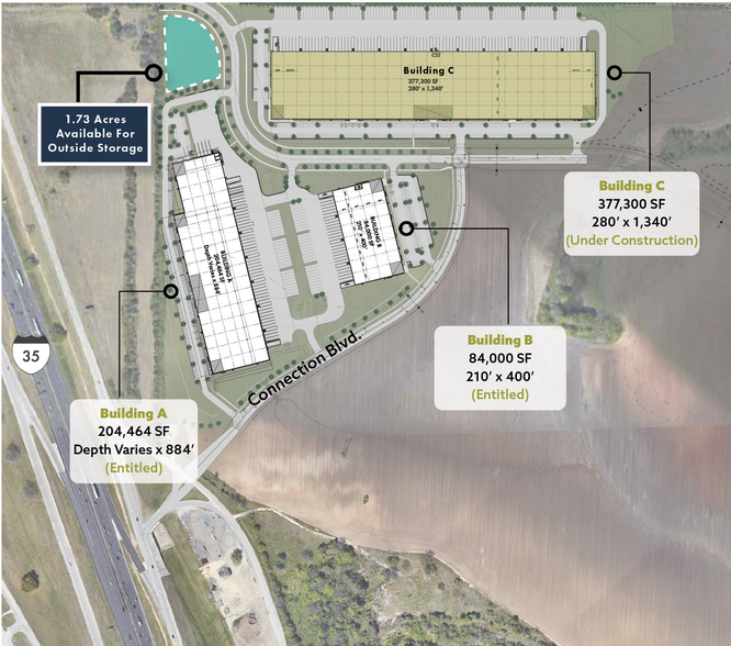 San Marcos Business Park is a 45-acre, master-planned industrial park located in the heart of the Texas Innovation Corridor between Austin & San Antonio. • Three-building, Class A industrial campus setting offers immediate access to I-35 • ± 20,000 SF to 650,000 SF available • Available for Lease, Sale, or BTS. • LI Zoning (light industrial). Permitted uses include distribution, manufacturing, assembly, R&D/flex, showroom, and outdoor storage. • Fully entitled sites available (A & B) • Building C: Under Construction (Available April 2026)