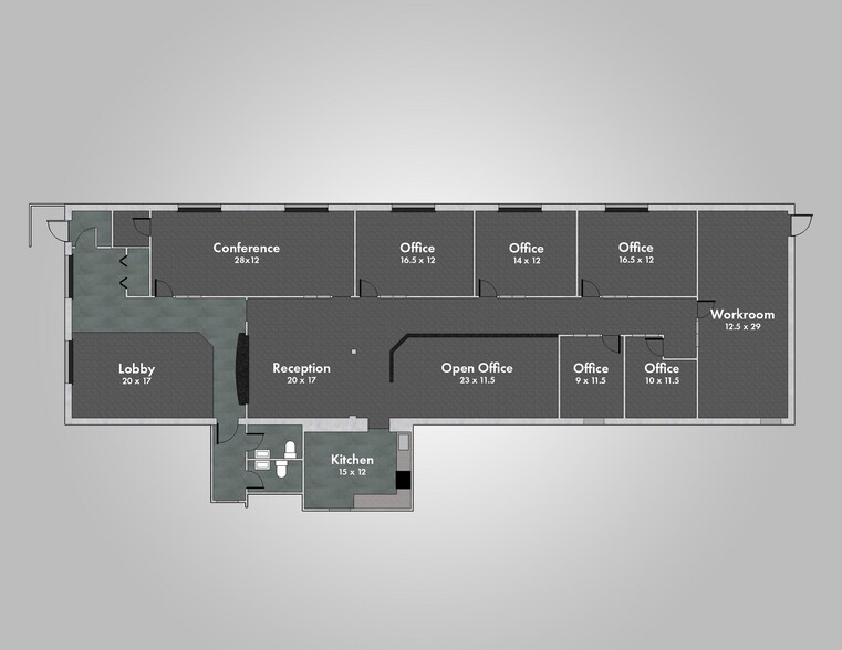 Includes 3 offices w/ windows, large conf. room, reception desk & lobby, 2 interior offices, open office area, large workroom area & kitchenette.