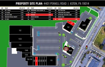 3 MOIS DE LOYER GRATUIT (minimum 3 ans de bail) ! ! 3 UNITÉS DISPONIBLES Suite 162- +/- 1 600 SF (NOUVELLEMENT RÉNOVÉE) Ancien magasin de vape. Suite 164- +/- 1 600 pi2 - Anciennement Weight Watchers Suite 156-158 +/- 4 300 SF Ancienne Académie de vitesse Whirlwinds Vastes places de stationnement sur place. À quelques minutes de l'I-95, de la route 322 et de l'aéroport de Philadelphie Aston.
