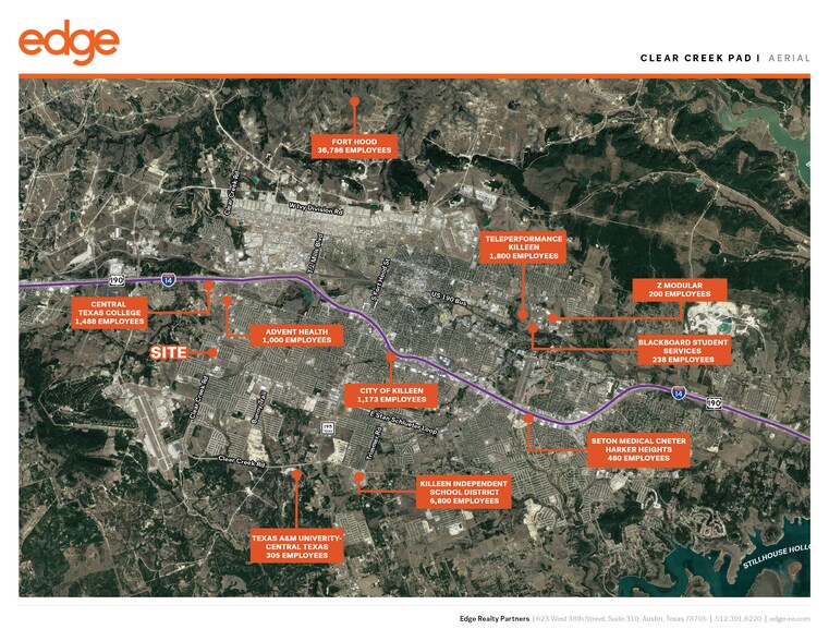 Property Description Clear Creek Pad Site Commercial Land Available for Development The Clear Creek Pad Site is located in Killeen, an area experiencing rapid growth. The site is located on Clear Creek Rd, one of the major access roads leading into Fort Hood that employs over 60,000 people and contributes over $35 billion to the Texas economy. Killeen is a city in Bell County, Texas. According to the 2020 census, its population was 153,095, making it the 19th-most populous city in Texas and the largest of the three principal cities of Bell County. It is the principal city of the Killeen–Temple–Fort Hood Metropolitan Statistical Area. Killeen is located approximately 50 miles southwest of Waco and about 60 miles north of Austin. Additionally, it is home of 1st Cavalry Division, and Fort Hood military base. The economy of Killeen is strongly dependent Fort Hood, whose military base is one of the largest in the country. Excellent Signage and Visibility Available Adjacent Neighbors: Taco Bell, Sonic, Scott White Hillcrest Zoned: Killeen: B-5: Business District Minutes From Fort Hood and I-14 1.1 Miles from Robert M. Shoemaker High School (2,259 Students) 0.7 Miles from Iduma Elementary School (816 Students) Clear Creek Road: 27,000+ Vehicles/Day Clear Creek Road Frontage: ±317' Property Depth: 300' Available Land: 2.172 Acres