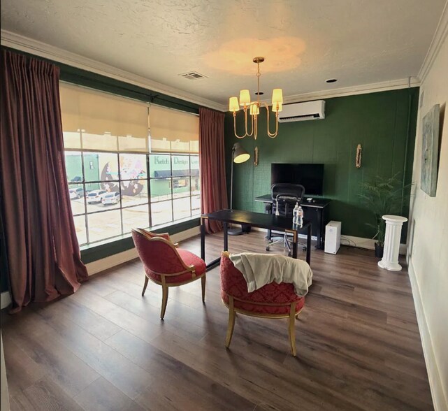 Ce charmant studio à l'étage est situé à côté de l'avenue Western historique. Les grandes fenêtres laissent entrevoir la lumière du soleil et donnent sur le théâtre Will-Rogers. L'espace à l'étage comprend une porte d'entrée privée donnant sur un magnifique escalier, un bureau privé avec grand placard, un espace de travail principal avec placard de rangement, une cuisine vintage pleine grandeur et une salle de bain complète. L'espace est une propriété historique construite en 1920 et récemment rénovée. Tous les nouveaux revêtements de sol, éclairage, peinture, comptoirs et appareils de plomberie. Les photos actuelles montrent l'espace utilisé comme studio avec un espace de conférence et un espace de travail partagé. Certains meubles sont en vente.