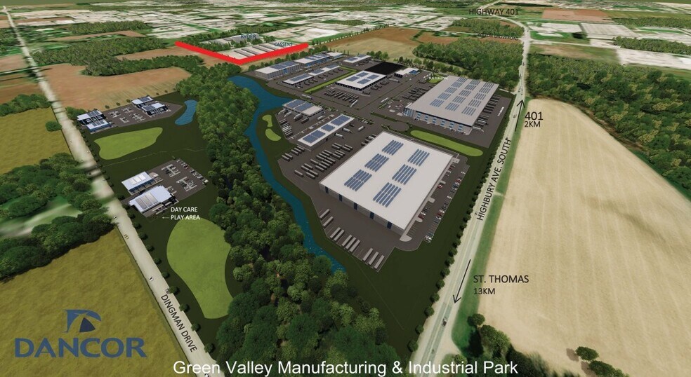 Coin de grande envergure à l'intersection de Green Valley Road et Highbury Ave avec un accès facile à l'autoroute 401. La phase 1 propose de nombreuses options industrielles différentes, allant d'environ 19 000 pieds carrés jusqu'à 300 000 pieds carrés. Pour un projet industriel clé en main, le propriétaire peut livrer un bâtiment environ 12 mois après l'approbation des plans et la signature des contrats. Les bâtiments proposés sont en béton préfabriqué, avec une hauteur libre de 28 pieds et incluent 5 % de bureaux. Les taux de location peuvent varier en fonction des spécifications.