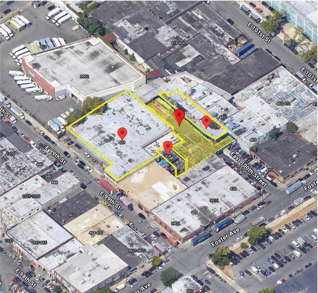 3 Lots across a 78,161 SF plot with 49,114 SF of buildings in a Prime Brooklyn Area (Includes 443 East 100th St - 19,387 SF Bldg. on 32,161 SF plot) (458 East 100th St - 2,592 SF Bldg. on 10,000 SF plot) and (439 East 99th St - 27,135 SF Bldg. on 36,000 SF plot). Multiple Loading Doors; Heavy Distributed Electric Service; Extensive Gas throughout for food production and heating; ample floor drains; tiled floors and walls, and two-street access.