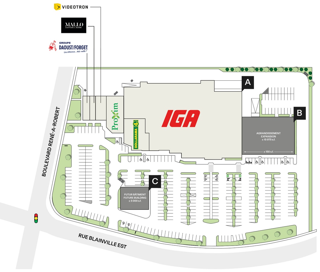 Situé à l'intersection très visible du Boulevard René-A.-Robert et de la Rue Blainville Est, le Centre René-A.-Robert offre une destination commerciale de choix au cœur d'une communauté résidentielle florissante. Ancré par IGA et complété par des co-locataires solides tels que Dollarama et Proxim, ce centre axé sur le service bénéficie d'un flux de circulation exceptionnel et d'un accès pratique aux principales autoroutes, y compris l'Autoroute 640 et l'Autoroute 15. La propriété est entourée de grands détaillants nationaux comme Walmart, Rona et Super C, ainsi que d'institutions éducatives telles que l'Académie Ste-Thérèse et le Collège Lionel-Groulx, assurant un flux constant de visiteurs quotidiens. Une expansion totalisant ±21 000 pi² est prévue au Centre René-A.-Robert. Cette expansion comprendra un ajout de ±16 000 pi² adjacent à IGA, conçu pour accueillir jusqu'à 5 nouvelles entreprises, ainsi que la construction d'une nouvelle plateforme de ±5 000 pi².