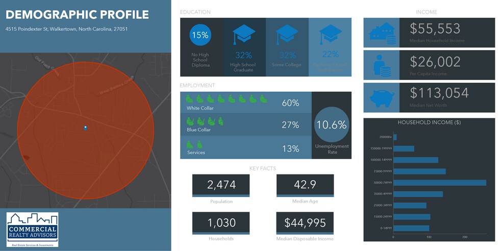 Construisez vos minutes d'affaires au centre de l'aéroport international du Piémont sans payer de prime. Cette propriété de 2 acres se trouve à seulement 15 minutes de route au nord de Winston-Salem. Walkertown est une collectivité rurale accueillante en croissance rapide dont le coût de la vie est de 17,4 % inférieur à la moyenne américaine. Voici une occasion unique de profiter des avantages d'une petite ville et de ses faibles impôts, mais avec un accès facile aux grands réseaux de transport.