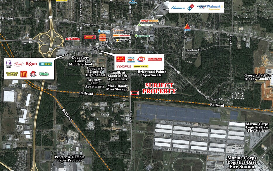 Lot is located just north of the railroad tracks and US Marine Corps Logistics Base. Conveniently situated, this location offers quick access to both Highway 82 and Highway 19. Within the area you’ll find prominent neighbors such as Super Wal-Mart, Walgreens, Roses, USPS, Mock Road Mini Storage, and a variety of restaurants and other retail options.