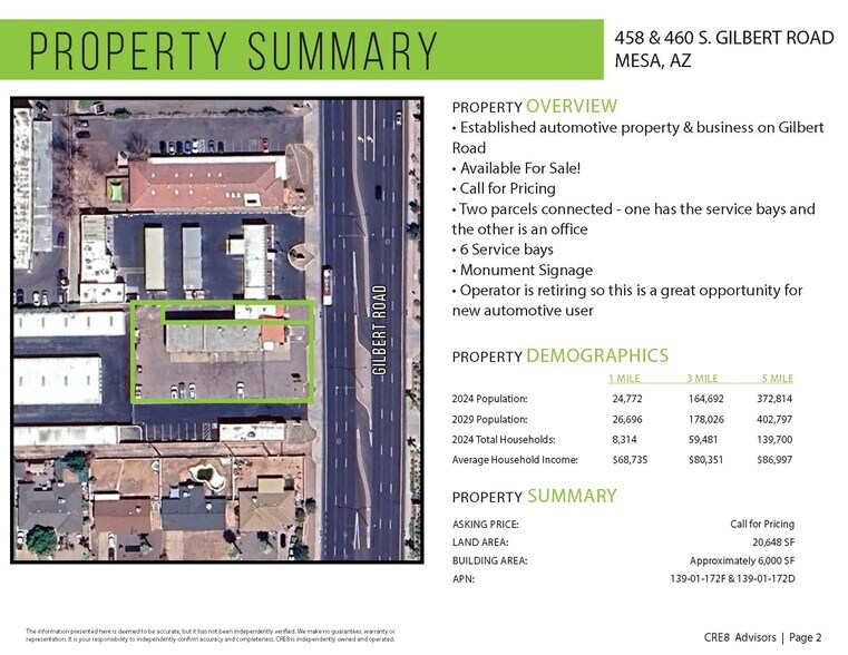 458 and 460 S Gilbert Road represent a rare chance to acquire an established automotive property along one of Mesa’s most recognized norths–south commercial arterials. Located minutes from the US-60 freeway and surrounded by dense residential neighborhoods and active retail corridors, the property sits in the path of long-term growth supported by Mesa’s expanding population, strong workforce base, and business-friendly environment. Daily traffic counts along Gilbert Road reinforce the visibility and long-standing commercial appeal of this corridor, bringing consistent demand for automotive services and owner-user operations.