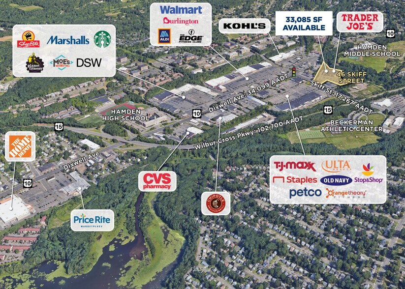 Situé à Hamden, une petite ville du comté de New Haven, Connecticut, cette propriété est une destination pratique pour les résidents et les entreprises. Il est situé dans le principal noyau commercial de la région, qui comprend Kohl's, Aldi, Walmart, Staples et plus encore. La propriété se trouve juste à côté de l'autoroute 15, sur la rue Skiff, au centre du populaire corridor de vente au détail.