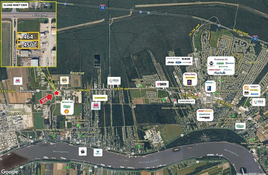 This property consists of two buildings totalling 9,600 sf on more than 70,000 sf of land which can be leased separately or together. It is located half a block off Blues Highway (US Highway 61) which has 13,933 vpd and situated in dense industrial/commercial area of Reserve, near the Marathon Garyville Refinery, schools, and national retailers.