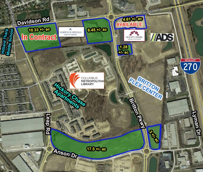 Situé à l'angle sud-ouest de la I-270 et du chemin Davidson. Terrain disponible le long du chemin Davidson, du chemin Leap, de la promenade Britton et de la promenade Anson City of Hilliard. De nombreuses zones différentes disponibles avec des sites potentiels pour de multiples utilisateurs. Les aménagements immédiats à proximité comprennent la nouvelle succursale Hilliard de la Columbus Metro Library, le complexe à usage mixte The Greyson at Hickory Chase, le Mount Carmel Rheumatology, l'église Rock City, le centre communautaire, le Britton Flex Center et Advanced Drainage Systems.