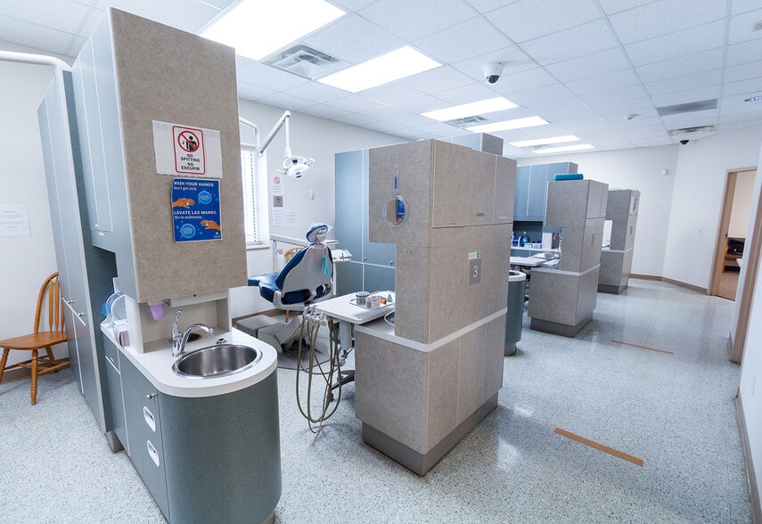 - 8 dental operatories with flatscreen televisions