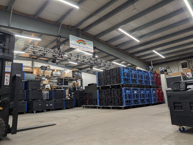The property includes existing mezzanine storage, warehouse racking, and a comprehensive security system with interior and exterior cameras, all of which will remain with the building. Mezzanine, racking and demising walls can all be removed to create one large open space without affecting building structure.