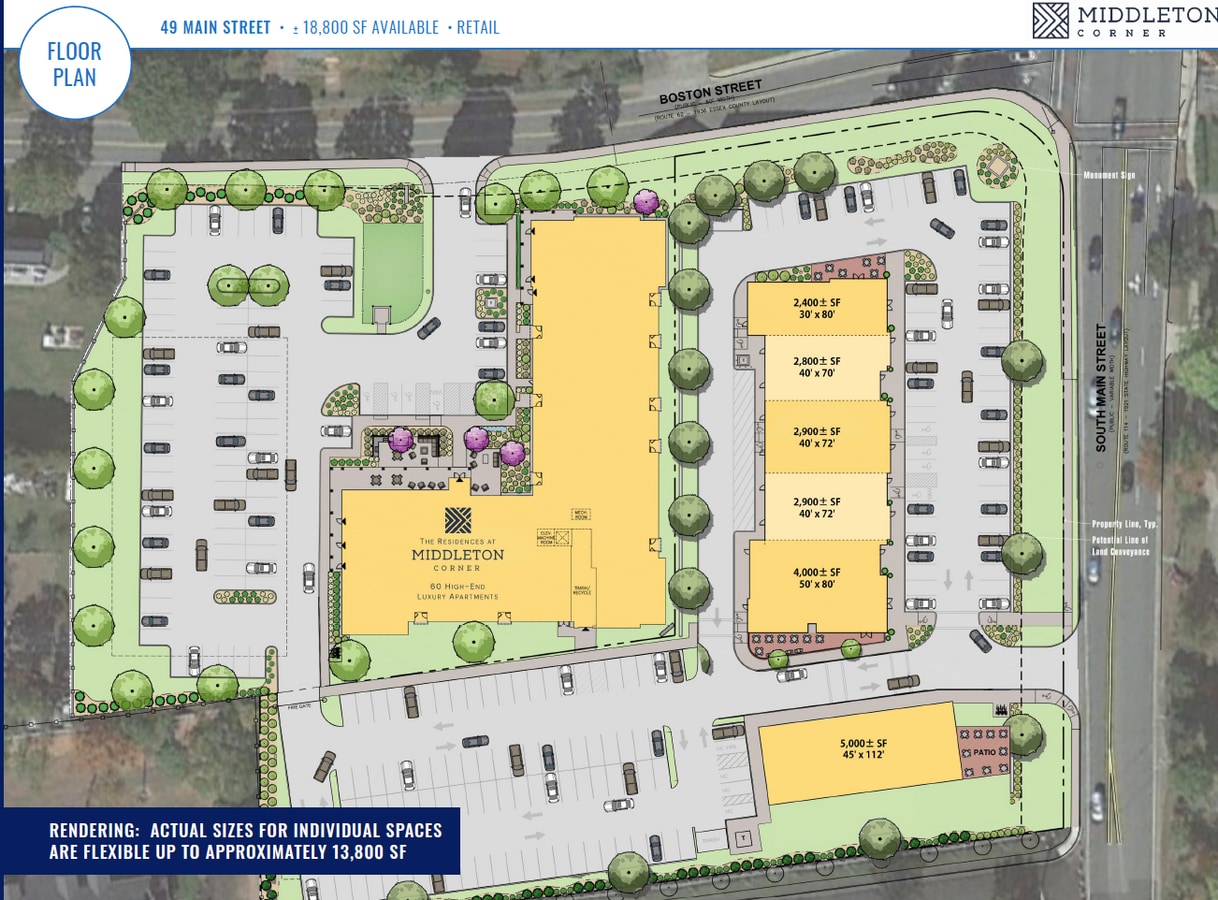 Middleton Corner will be a mixed-use development comprised of a 60 unit high-end luxury apartment complex with approximately 18,800 SF of retail on over 5 acres at the intersection of Routes 62 and 114. Additionally, this and the other new residential projects built and under construction along Route 114 will complement the years long town project of relocating and condensing the Middleton Town Services to a centralized “Middleton Municipal Complex” within a 5-minute walk of the site