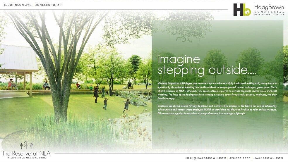 Haag Brown Commercial Real Estate & Development est ravi de lancer un nouveau partenariat avec NEA Baptist qui propose un parc de bureaux de style de vie. La réserve de NEA est un développement médical axé sur le style de vie de 11 acres qui est une extension virtuelle du campus du système de santé baptiste de la NEA. En 2016, nous avons créé The Reserve at Hill Park, le premier parc de bureaux axé sur le style de vie de la collectivité. « La réserve à Hill Park a été si bien accueillie que nous voulons reproduire tout le projet à côté du plus grand campus de soins de santé intégrés planifié par le maître dans notre zone commerciale. Notre croyance en la qualité de vie et au bien-être sera illustrée par ce projet », a déclaré Joshua Brown. Ce paysage de premier plan est directement lié au campus du système de santé baptiste de l'AEN et comprend 2 bâtiments existants et 3 sites de construction potentiels avec systèmes individuels de patio, un sentier pédestre polyvalent qui englobe l'ensemble du projet et se connecte à NEA Baptist, de multiples éléments d'eau, un pavillon au bord du lac et trois espaces verts distincts. La réserve de NEA est idéale pour tous les professionnels de la santé qui veulent se loger à distance de marche de NEA Baptist et offrir à leurs clients un accès exclusif et pratique à toutes les installations du système. La phase II du projet ouvrira des possibilités de restauration et de vente au détail à l'angle de Bridger et de l'autoroute 49. *Veuillez noter que toutes les transactions sont sujettes à l'approbation de l'utilisateur par le promoteur et NEA Baptist. Les clauses et les restrictions les plus strictes sont en place. Le propriétaire est le promoteur et envisagerait également une construction adaptée à laquelle le même processus d'approbation s'applique.