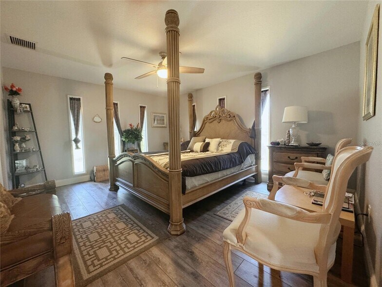 This unique property offers a rare combination of luxury living and commercial opportunity in the thriving Ocala market. Situated on 7.9 acres of high-and-dry land, the estate features a fully remodeled 4-bedroom, 2.5-bath home with elegant finishes and a functional layout. The interior boasts a modern kitchen with stone countertops, a breakfast bar, and a formal dining area, complemented by a spacious family room with a fireplace and seamless access to an expansive outdoor patio. The main floor primary suite includes dual vanities, while new flooring throughout enhances the home’s appeal.