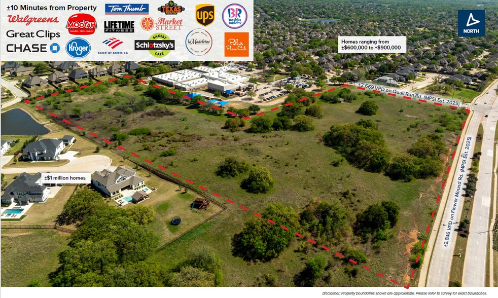 The Property is accessed by Flower Mound Road and Quail Run Road and bordered by highly affluent neighborhoods with homes ranging from ±$1.5 million to +$2 million. Mature neighborhoods in this area have homes ranging in price from ±$700,000 to ±$1 million. The Property provides ready access to Cross Timbers Road, a major east, west thoroughfare providing direct access to Interstate 35W, Interstate 35E and subsequent access to Dallas North Tollway, Sam Rayburn Tollway, and Highway 121. These major thoroughfares connect the property to major entertainment and lifestyle destinations and employment centers that include Grapevine, Southlake Town Square, Grandscape, Legacy West, Legacy Town Center, Granite Business Park, Hall Office Park, The Star, Grapevine Lake, Lake Lewisville, miles of hike and bike trails, and DFW International Airport.
