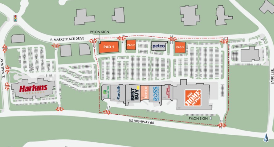 Trois plaquettes disponibles à la vente dans le cadre du bail foncier sous-jacent de l'État. Tailles de 5 280, et deux à 6 000 pi2. La plupart des utilisations commerciales sont permises. Situé en face de Home Depot, World Market, Ross Dress for Less, Dollar Tree et Harkins Theatre.